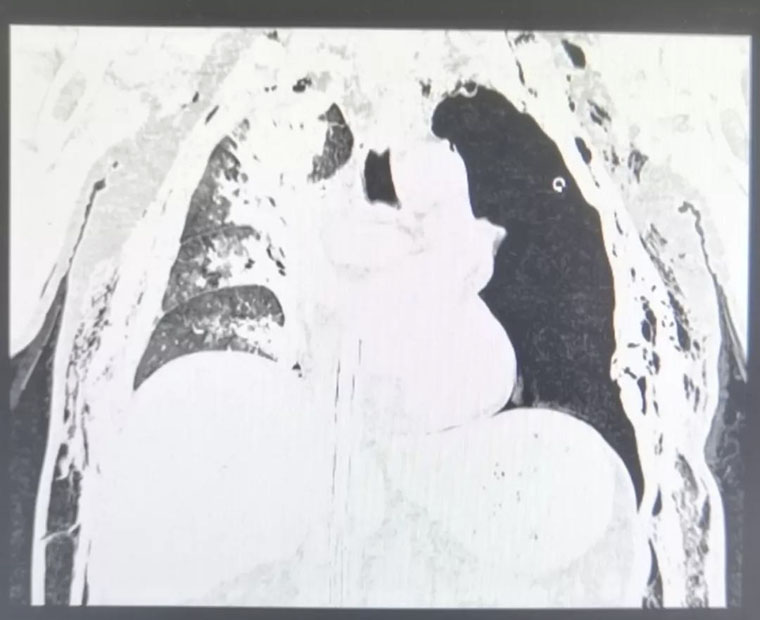 然而,大量的气泡从胸腔闭式引流管喷出,我们意识到,这样下去肯定不行,带ECMOCT检查,再次请胸外科会诊,讨论手术的必要性。