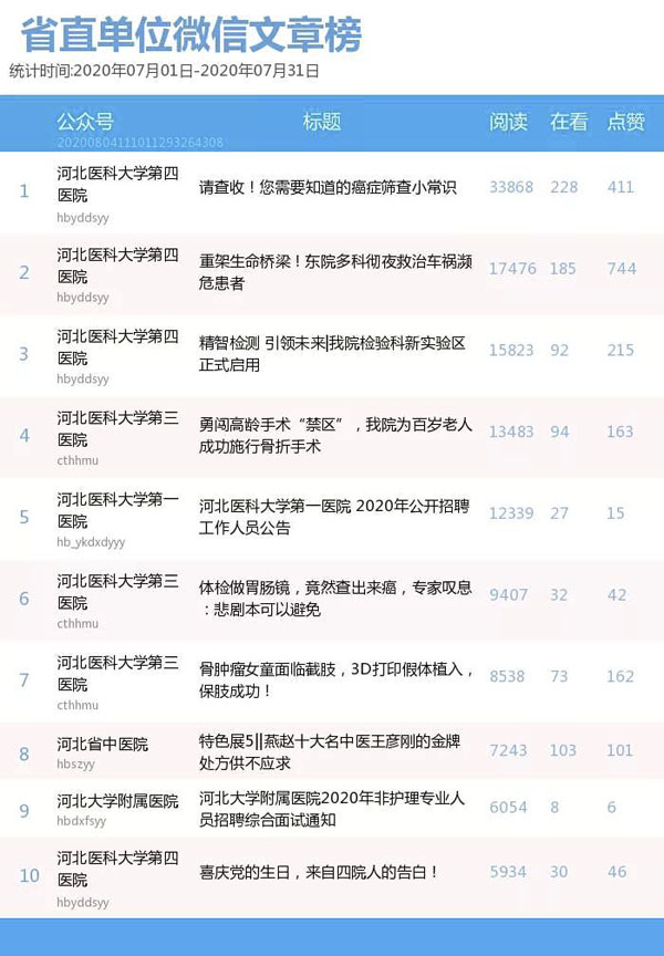 河北医科大学第四医院的《请查收!您需要知道的癌症筛查小常识》介绍了关于癌症筛查的相关科普知识。文章获得了33868的阅读量,位列第一。河北医科大学第四医院的《重架生命桥梁!东院多科彻夜救治车祸濒危患者》介绍了该院成功救治一名主气管离断、肺挫伤、多处肋骨骨折等复合型危重创伤患者的故事。文章获得了17476的阅读量,位列第二。河北医科大学第四医院的《精智检测 引领未来|我院检验科新实验区正式启用》介绍了该院检验科举行新实验区启用仪式相关信息。文章获得了15823的阅读量,位列第三。