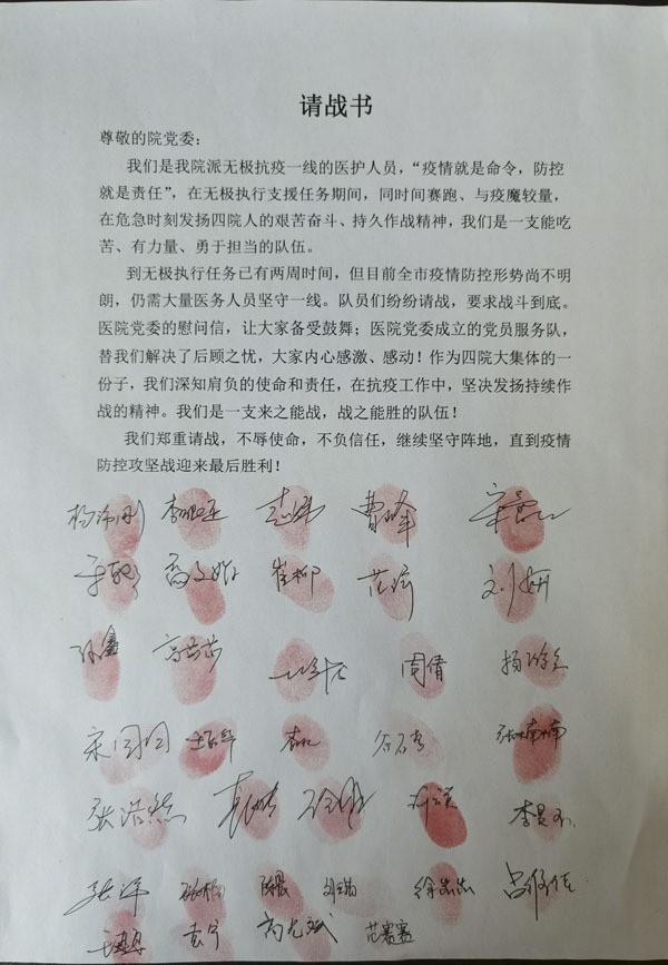 在党员先锋模范作用的感召下,无极核酸采集队已有20多名队员递交了入党申请书。在他们执行任务的第15天,全体队员集体签下请战书,要求继续坚守阵地,战斗到底,直到迎来最后的胜利。