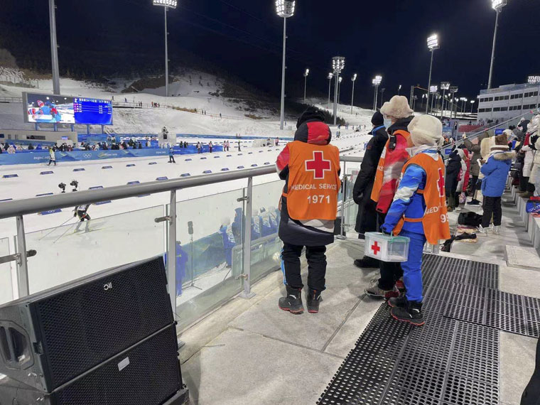 国家冬季两项中心的赛道总长8.7公里,不仅考验着运动员的体力,对医疗队全体成员的外伤急救处理能力也是巨大挑战。在保障期间,队员们根据各类医疗站布局及保障特点,将医疗物资进行合理分类配置;测试医疗设备、集群、视频通话记录仪;全体医护人员集中强化学习和模拟演练,完成了呼吸机使用技能强化培训、AED使用技能强化培训;骨折伤员就诊与病例上报模拟演练、运动员医疗站医护人员和救护车医护人员对接配合救援转运模拟演练、FOP医疗站紧急处置受伤运动员演练等。国际奥委会医学科学部医疗组主席和专家团成员两次来到我院负责的医疗站进行考察,赞扬医疗站工作做到了“在细节之处见功夫”。