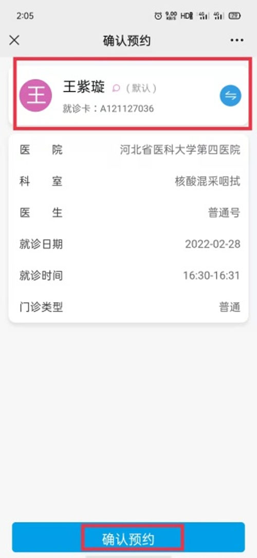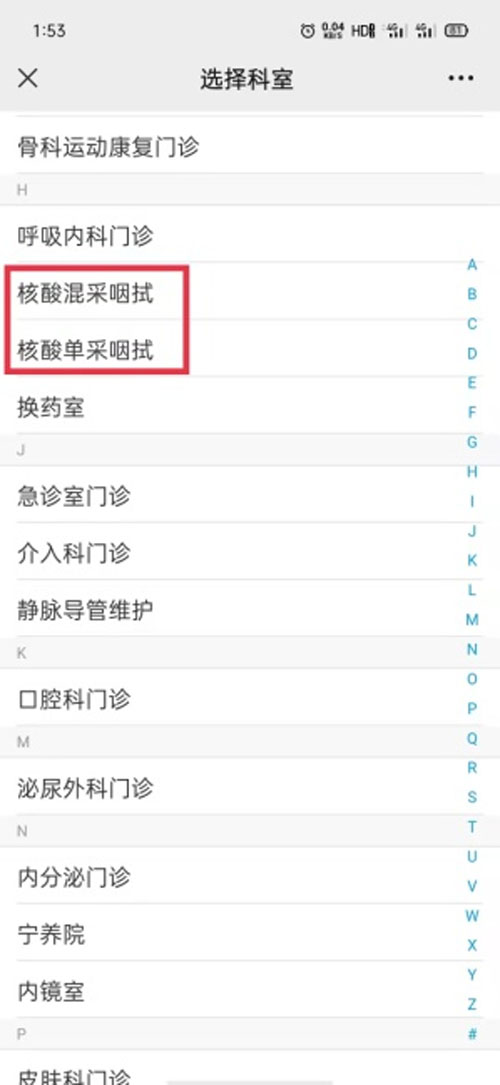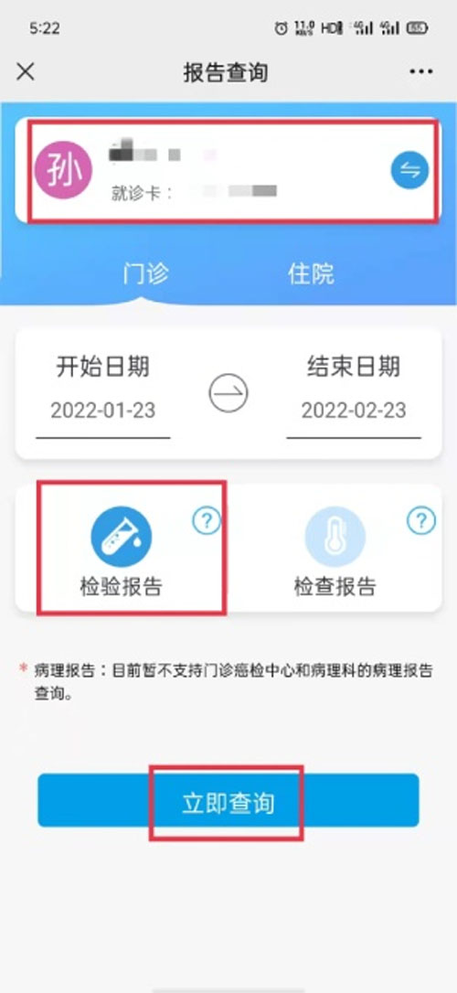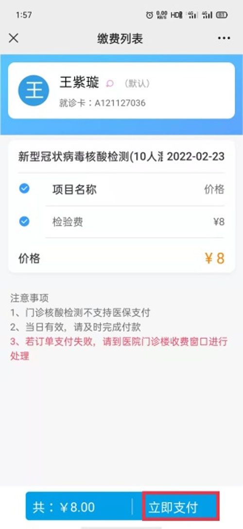 标本采集处手机出示电子健康卡二维码进行核酸检测:查询服务→电子健康卡→点击就诊人电子健康卡片→电子健康卡详情。