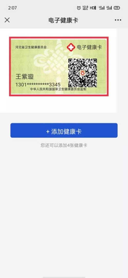 查询服务→电子健康卡→添加电子健康卡(可以添加多人)→填写个人信息→添加成功后会在电子健康卡列表中显示。