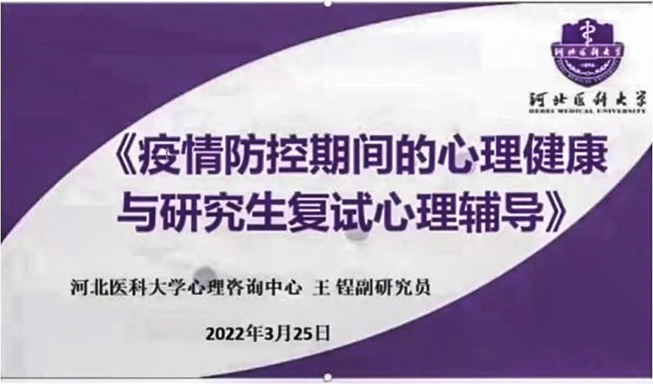325日,为提高本科2018级护理和助产专业实习学生应对心理危机事件、缓解心理压力的能力,帮助学生顺利度过考研复试、求职备考阶段,我院护理教学办公室邀请河北医科大学心理咨询中心王锃主任,进行了“疫情防控期间的心理健康与研究生复试心理辅导”专题心理讲座。本次讲座以线上形式进行,护理教学办公室班主任吴景梅、段红霞及本科2018级全体实习学生参加。