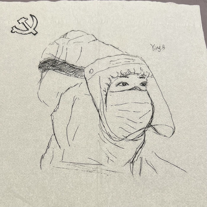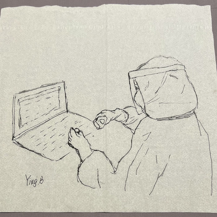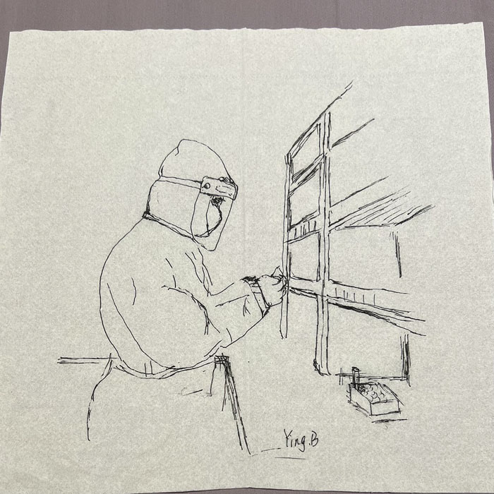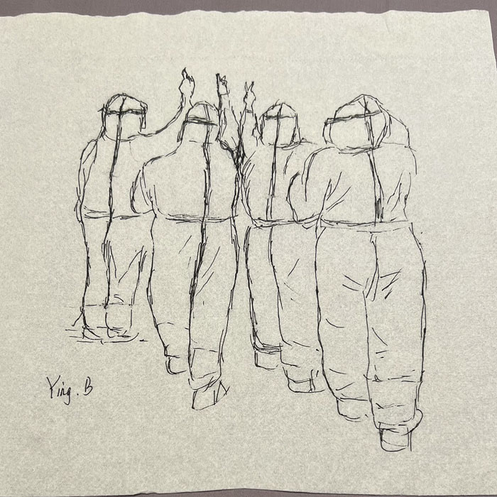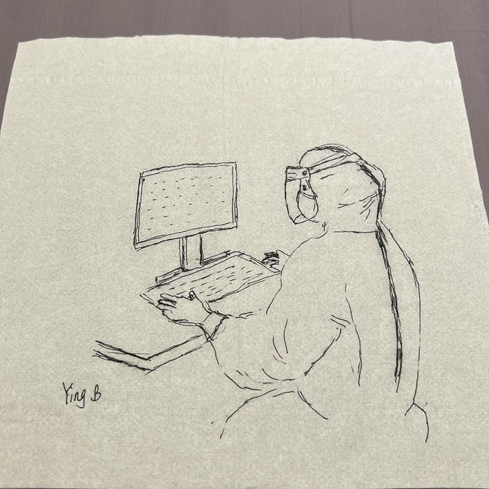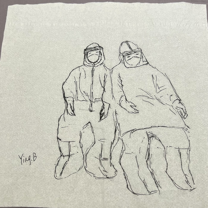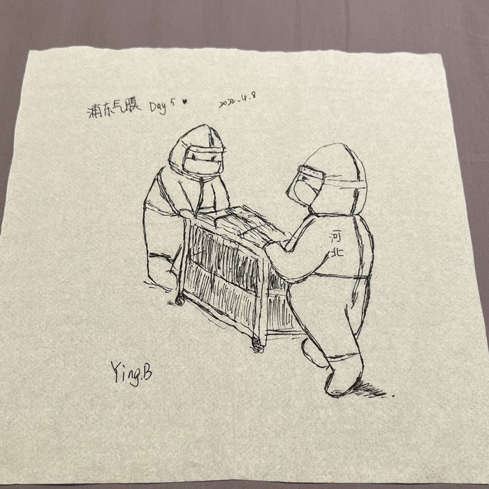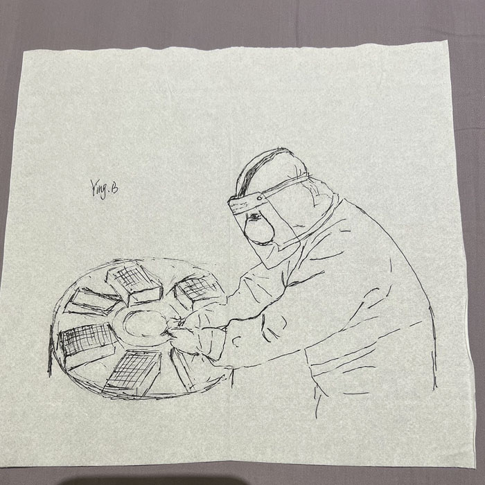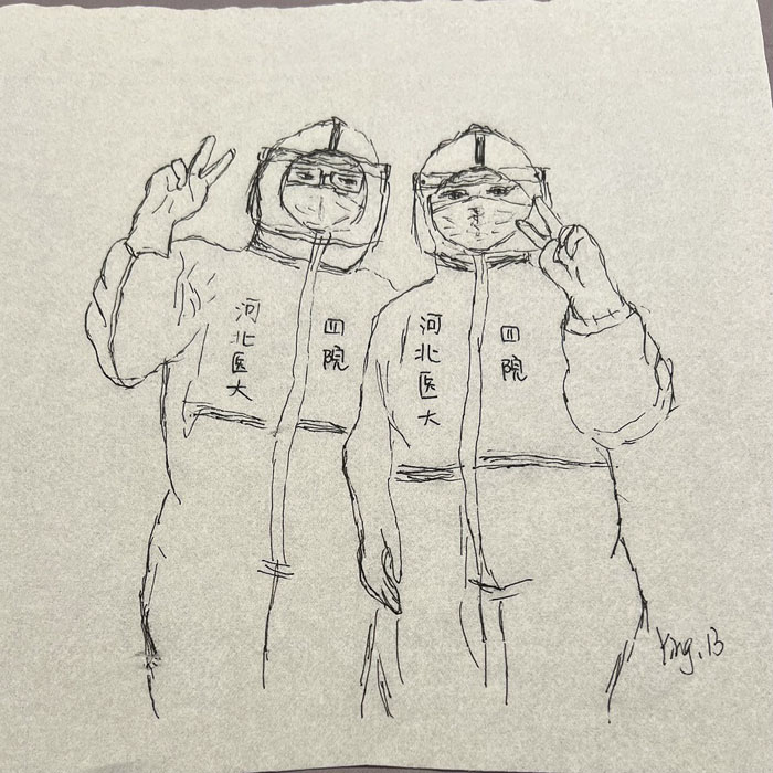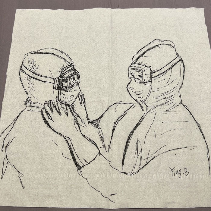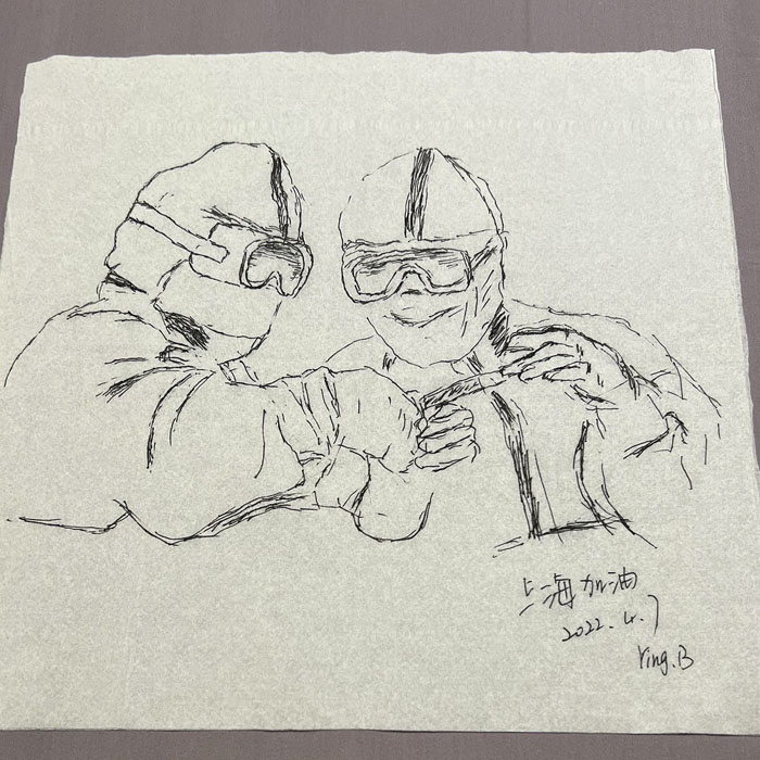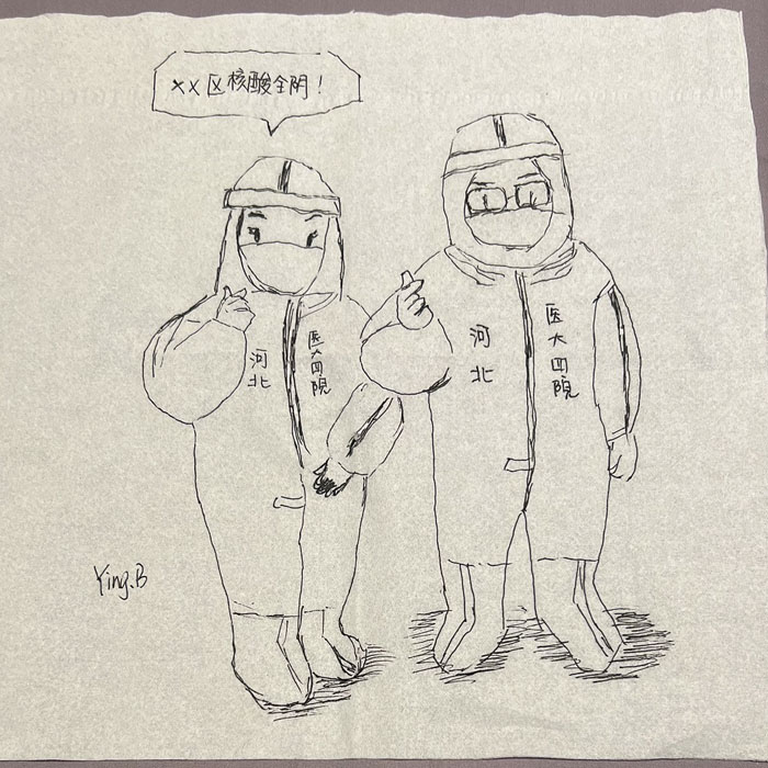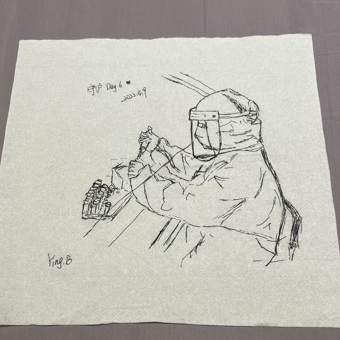 我院检验科的马鸣、巨英博、王霏霏、王姿4名共产党员及刘丹(入党积极分子)、米培、武一鹏、张旭威共8名业务骨干,第一时间报名参战。他们当中,副高职称1名、中级职称5名、博士2名、硕士3名,均有参加大规模核酸检测的实战经验。巨英博同志在繁忙的工作后,利用休息时间在简陋的纸巾上“作画”,记录下平凡而伟大的瞬间。