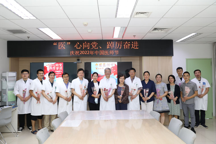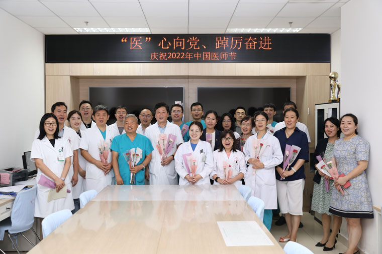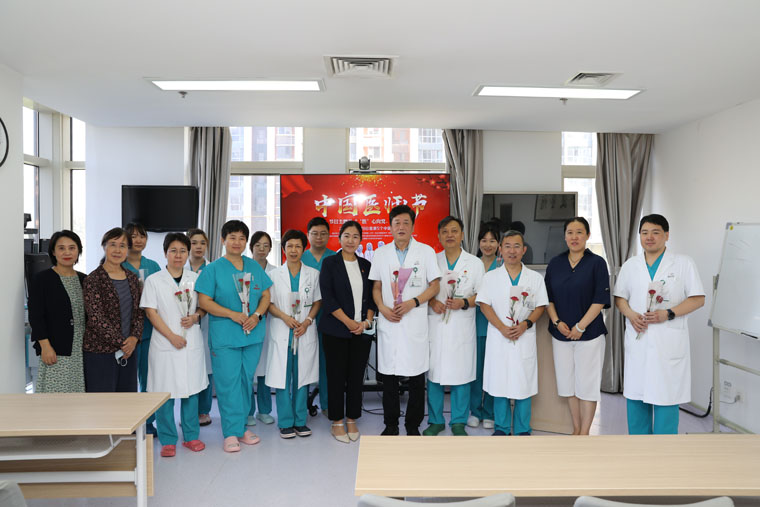 慰问团向重症医学科胡振杰教授、外三科李勇教授、呼吸内科丁翠敏教授、急诊科王澜涛教授4位医师代表及科室人员送上鲜花,亲切表达了节日的祝福与问候,并通过他们向奋战在医疗战线上的广大医师致以崇高的敬意和衷心的感谢。刘运江副院长表示,希望大家牢记“健康所系,性命相托”的誓言,发扬好“‘医’心向党、踔厉奋进”的精神,为建设“健康中国”“健康河北”、提高人民健康水平、增强人民群众获得感、幸福感、安全感作出新的更大贡献。