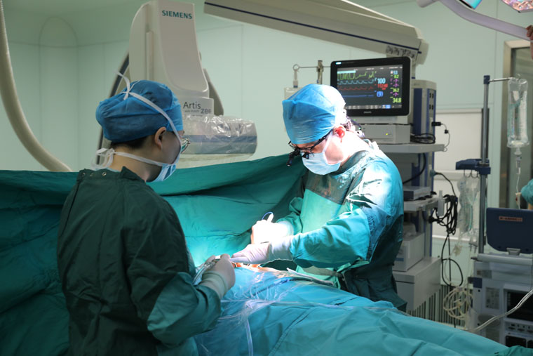 5年前曾行PCI术的一名患者因“心绞痛”再次入院,该患者冠心病史已有20余年,频发心绞痛且伴有严重的高血压、糖尿病等基础性疾病。如何既能有效治疗,又能避免胸骨正中开胸的巨大创伤?这是摆在大家面前的一道难题。经过心血管内科马景涛教授团队和心脏血管外科赵永波副主任团队的缜密磋商,最后决定行“PCI(经皮冠状动脉介入治疗术)+小切口冠状动脉搭桥术”。关键时刻,DSA复合手术室成功解除燃眉之急。