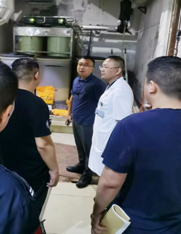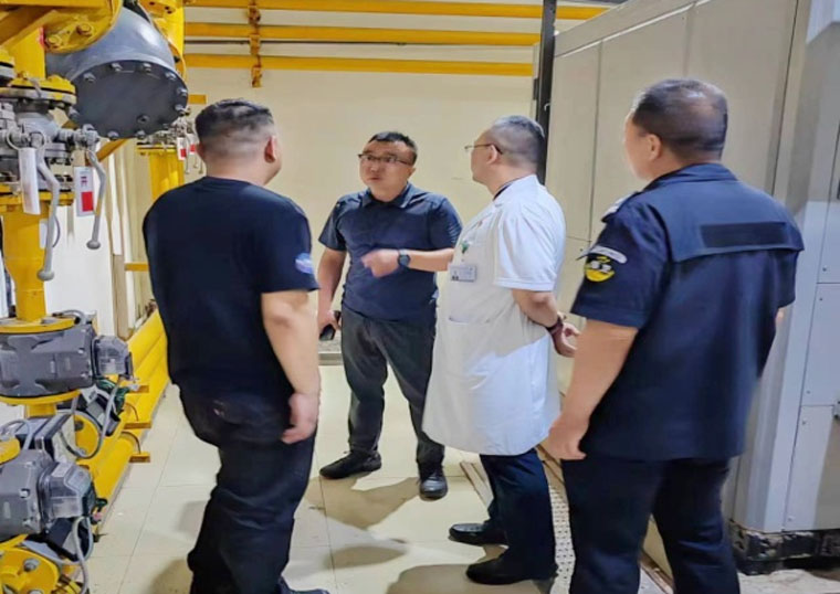 检查组一行先后到南楼制氧机房的燃气锅炉房、污水站、新医技病房楼负一膳食部进行排查,查看规章制度与安全警示标牌、燃气检漏、应急设施状态、锅炉房内安全和消防设施设备配备、食堂燃气安全管理等,并对涉及有限空间作业标识设置、作业审批、安全交底和防护救援设备等情况详细检查。