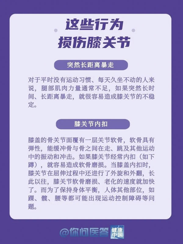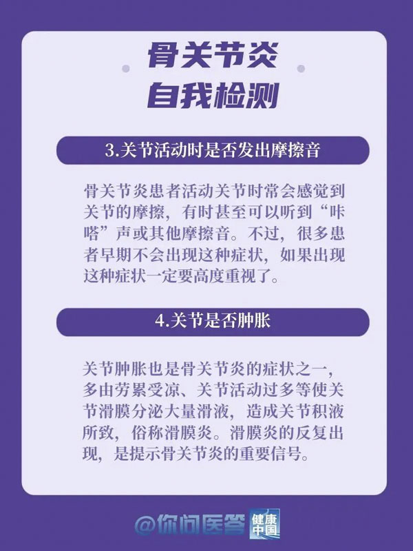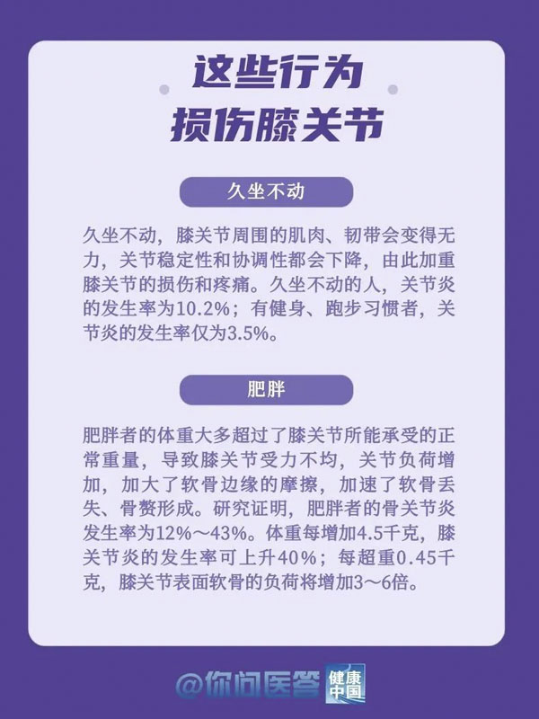 10月12日是世界关节炎日。关节炎是常见的慢性疾病之一。关节炎的种类繁多,其中以骨关节炎患病率最高。骨关节炎好发于负重关节及活动量较多的关节,如膝关节、髋关节等。你的膝关节还好吗?生活中,有哪些常见的“伤膝”行为?保护关节,转给你关心的人!