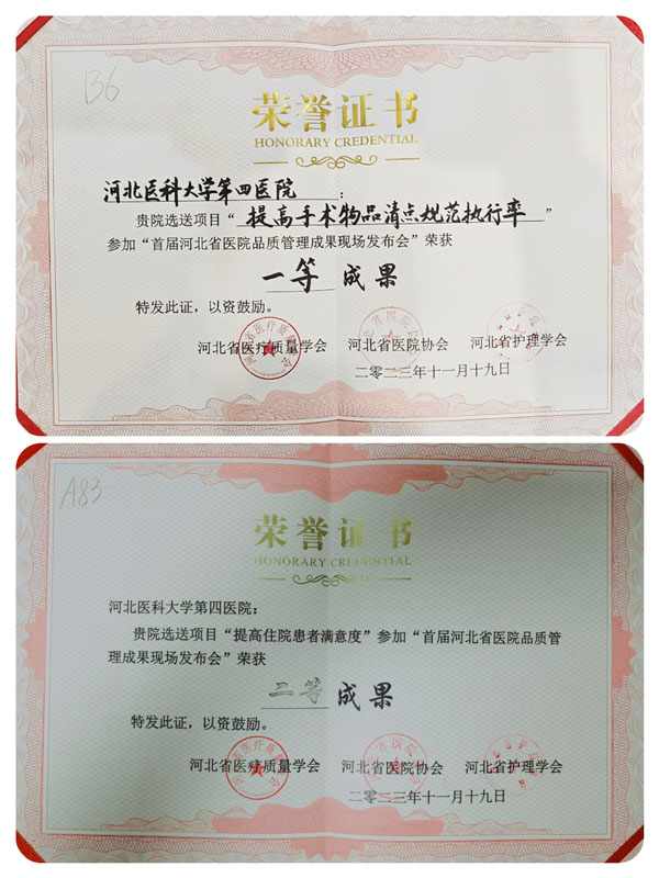 11月17—19日,由河北省医疗质量学会、河北省医院协会、河北省护理学会共同举办的“首届河北省医院品质管理成果大赛”在石举行。经过激烈角逐,东院手术室护士周俊杰的《提高手术物品清点规范执行率》、东院放疗科护士卢霄蒙的《提高住院患者满意度》分获一等成果奖和二等成果奖。