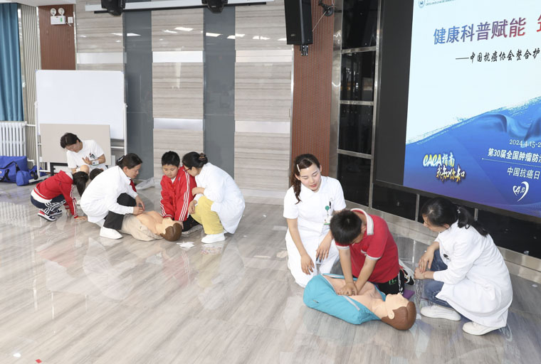 4月15-21日是第30个全国肿瘤防治宣传周,为帮助青少年学习健康科学知识,培养健康管理技能,全面提升健康素养,4月19日,省抗癌协会护理专委会联合我院护理部组织胃肠外科田夏青、肝胆外科李新省、放疗科马晓果、儿科赵翠芳、眼科杨丽曼、儿科才越越、胡亚美等8名护理专家到长征街小学光华校区与广大师生一起举办了“整合护理进中小学活动”,300余名师生参加。