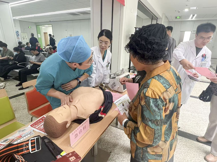 急诊科李琳、刘娜、张宁等医护团队通过“场景化教学”,详细讲解心肺复苏(CPR)与海姆立克急救法操作要点。在模拟人实操环节,团队针对按压深度、频率、人工呼吸比例等关键环节逐一纠偏,并演示AED(自动体外除颤器)与呼吸面罩的协同使用方法。骨科张子博围绕常见骨折类型与紧急处理方法,介绍了骨折的判断依据,以及不同部位骨折可能出现的特殊表现。一名参与急救实操的患者家属表示,“以前只在电视上看过急救,今天亲手操作才真正体会到分秒必争的意义,以后遇到类似情况心里就有底了。”
