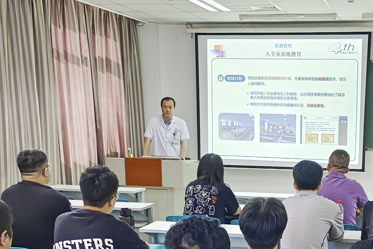 入培第一课由副院长田晓玲主持,常务副院长何宏涛对新学员表示欢迎,并详细介绍医院的发展概况以及研究生、住培教学工作开展情况,他勉励学员“遇良师、结益友,以仁心仁术践行医者使命”。