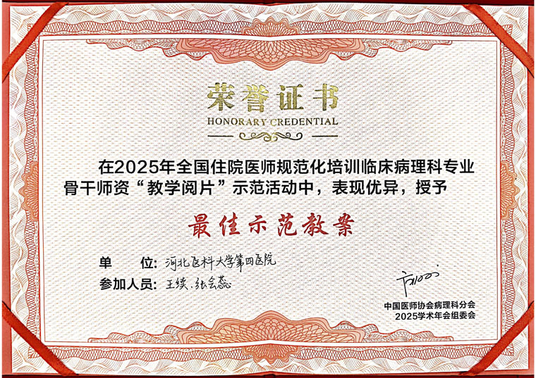 近日,2025年中国医师协会病理科医师分会年会暨第十八届中国病理医师年会在济南落幕。我院临床病理科专业基地受邀进行现场展示,荣获“最佳示范教案”与“教学阅片潜力示范精品课程”两项荣誉。同时,基地投稿论文《“四轮驱动,协同跃迁”临床病理科住培培养体系构建》成功入选年会优秀论文。
