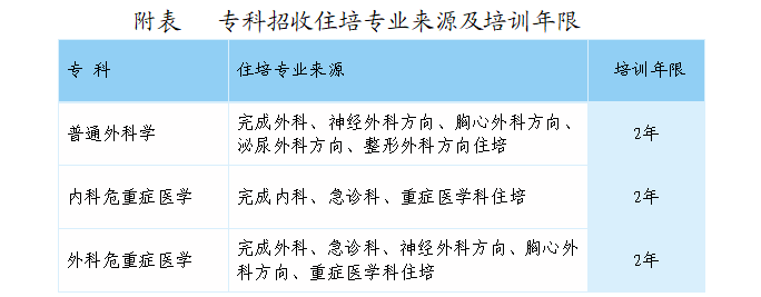 1.完成住院医师规范化培训(以下简称住培)取得合格证书并自愿参加专培的临床医师,申报专科应与住培专业来源一致。申报的培训专科与住培专业来源的对应要求见附表。