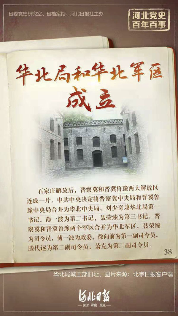 石家庄解放后,晋察冀和晋冀鲁豫两大解放区连成一片。为适应解放战争形势发展的需要,刘少奇于1948年2月向中央建议,由于晋察冀和晋冀鲁豫两个解放区已经连成一片,而且局势稳定,为了更有利于政治、经济、文化的发展和解放战争的顺利进行,应将两区、两局合并。很快,中共中央采纳了他的建议,于5月9日作出决定:将晋察冀中央局和晋冀鲁豫中央局合并为华北中央局,刘少奇兼华北局第一书记,薄一波为第二书记,聂荣臻为第三书记。晋察冀和晋冀鲁豫两个军区合并为华北军区,聂荣臻为司令员,薄一波为政委,徐向前为第一副司令员,滕代远为第二副司令员,萧克为第三副司令员,赵尔陆为参谋长,罗瑞卿为政治部主任。中共华北局和华北军区的成立,为华北人民政府的诞生创造了条件。