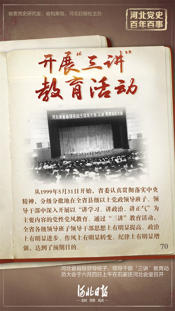 从1999年5月31日开始,省委认真贯彻落实中央精神,分级分批地在全省县级以上党政领导班子、领导干部中深入开展以“讲学习、讲政治、讲正气”为主要内容的党性党风教育。省级“三讲”教育从1999年5月31日开始至8月27日结束;市厅级“三讲”教育从1999年8月27日开始至2000年2月28日结束;县(市、区)“三讲”教育从2000年2月28日开始至2001年1月3日结束。通过“三讲”教育活动,全省各级领导班子领导干部思想上有明显提高、政治上有明显进步、作风上有明显转变、纪律上有明显增强,达到了预期目的。