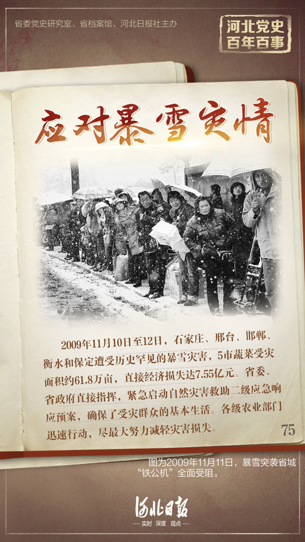 2009年11月10日至12日,石家庄、邢台、邯郸、衡水和保定遭受历史罕见的暴雪灾害,5市蔬菜受灾面积约61.8万亩,直接经济损失达7.55亿元。为切实做好暴雪等灾害性天气应对工作,保护人民群众生命和财产安全,河北省委、省政府直接指挥,紧急启动自然灾害救助二级应急响应预案,全力以赴投入抗雪救灾工作中,确保了受灾群众的基本生活。各级农业部门迅速行动,加强指导,狠抓各项防灾救灾措施落实,尽最大努力减轻灾害损失。11月12日,国务院总理温家宝到河北指导抗击雪灾工作强调,要加强领导,科学组织,狠抓落实,做好应对暴雪的各项工作,实现保民生、保生产、保运输的“三保”目标。