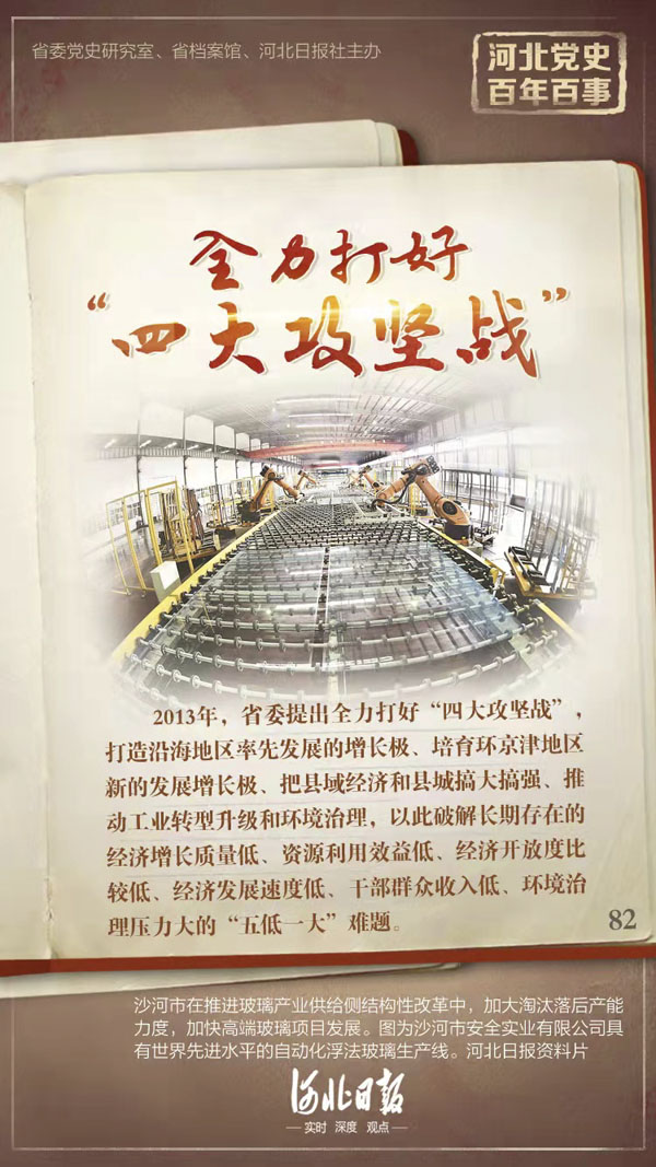 2013年,河北省委提出全力打好“四大攻坚战”,打造沿海地区率先发展的增长极、培育环京津地区新的发展增长极、把县域经济和县城搞大搞强、推动工业转型升级和环境治理,以此破解长期存在的经济增长质量低、资源利用效益低、经济开放度比较低、经济发展速度低、干部群众收入低、环境治理压力大的“五低一大”难题。