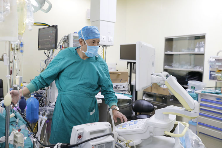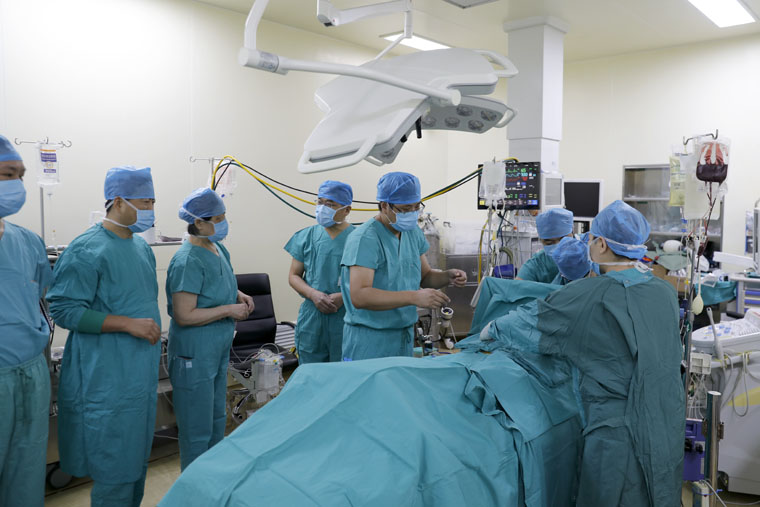 患者住院后仍有少量阴道出血,考虑大出血风险较大,遂将其转入心脏血管外科监护室,进行术前准备工作。预测的风险果然发生!11月21日清晨,患者突发阴道大出血,估测血量大于1500毫升。手术迫在眉睫,心脏血管外科即刻联系了手术室、麻醉科,大家争分夺秒,紧急准备出了一个手术间。麻醉科付建峰副主任和手术室冯立护士长赶往现场指导麻醉及手术的配合工作。
