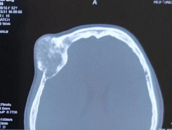患者主因右眼视物不清伴眼球突出3年,以右眼眶内占位收入我院眼科。眼科郝玉华教授在检查中发现,患者右眼视力极低,右眼上睑下垂,眼球突出且运动明显受限。眼眶CT提示眶内巨大占位,几乎占据球后整个眶间隙。同侧额部颅骨骨质亦显示巨大肿瘤,约7*7 cm大小。患者已经有上睑下垂和视力明显下降的症状,表明肿物已经对眶上裂神经和视神经有一定压迫。